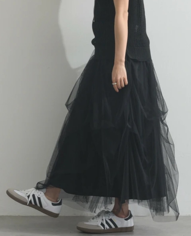 タック デザイン チュール スカート 動くたびにふんわり揺れる、タック入りのチュールスカートです。 繊細なチュール素材にタックを施すことで、程よいボリュームと立体感をプラス。 甘すぎず上品な印象で、カジュアルからきれいめまで幅広く着回せるデザインです。 やスウェットでカジュアルダウンしたり、ブラウスできれいめにも対応。 年中活躍する、ワードローブに1枚あると便利なチュールスカートです。 【着用サイズ】F ウエストゴム 【素材・成分】 表地:ポリエステル100% 裏地:ポリエステル100%