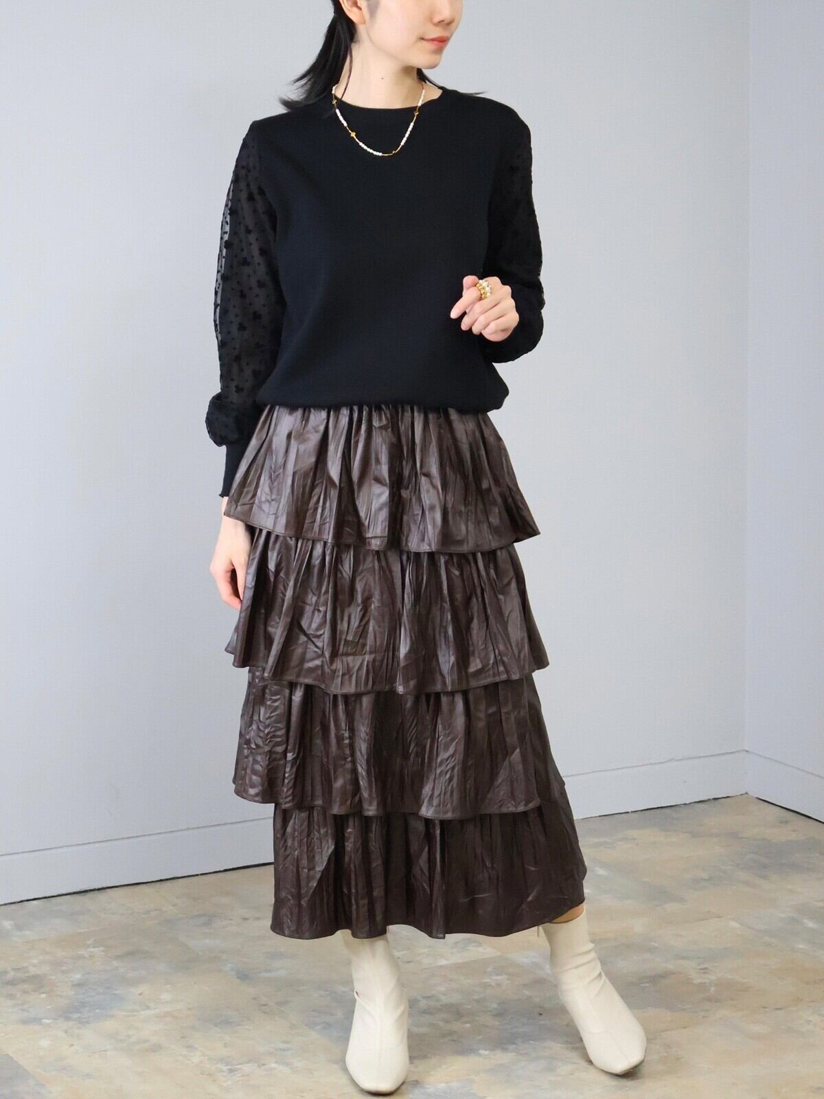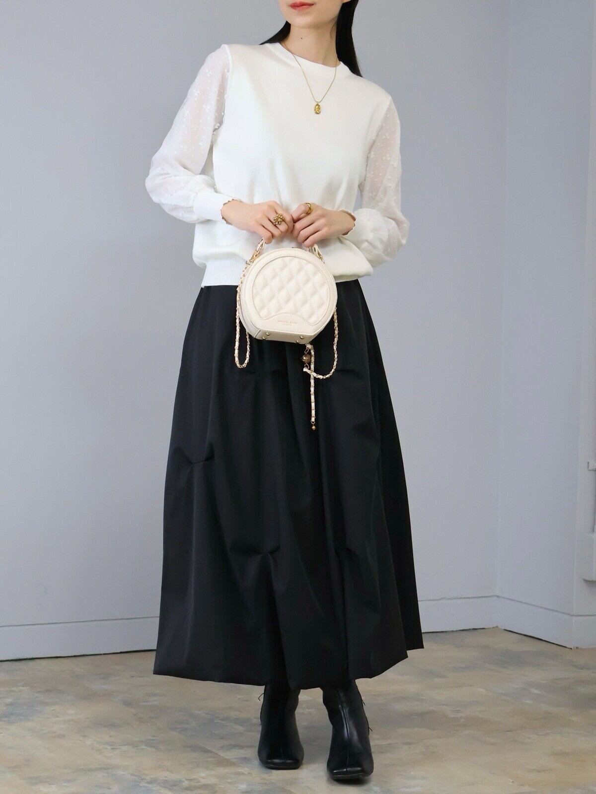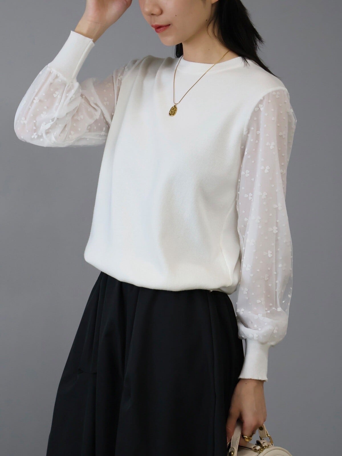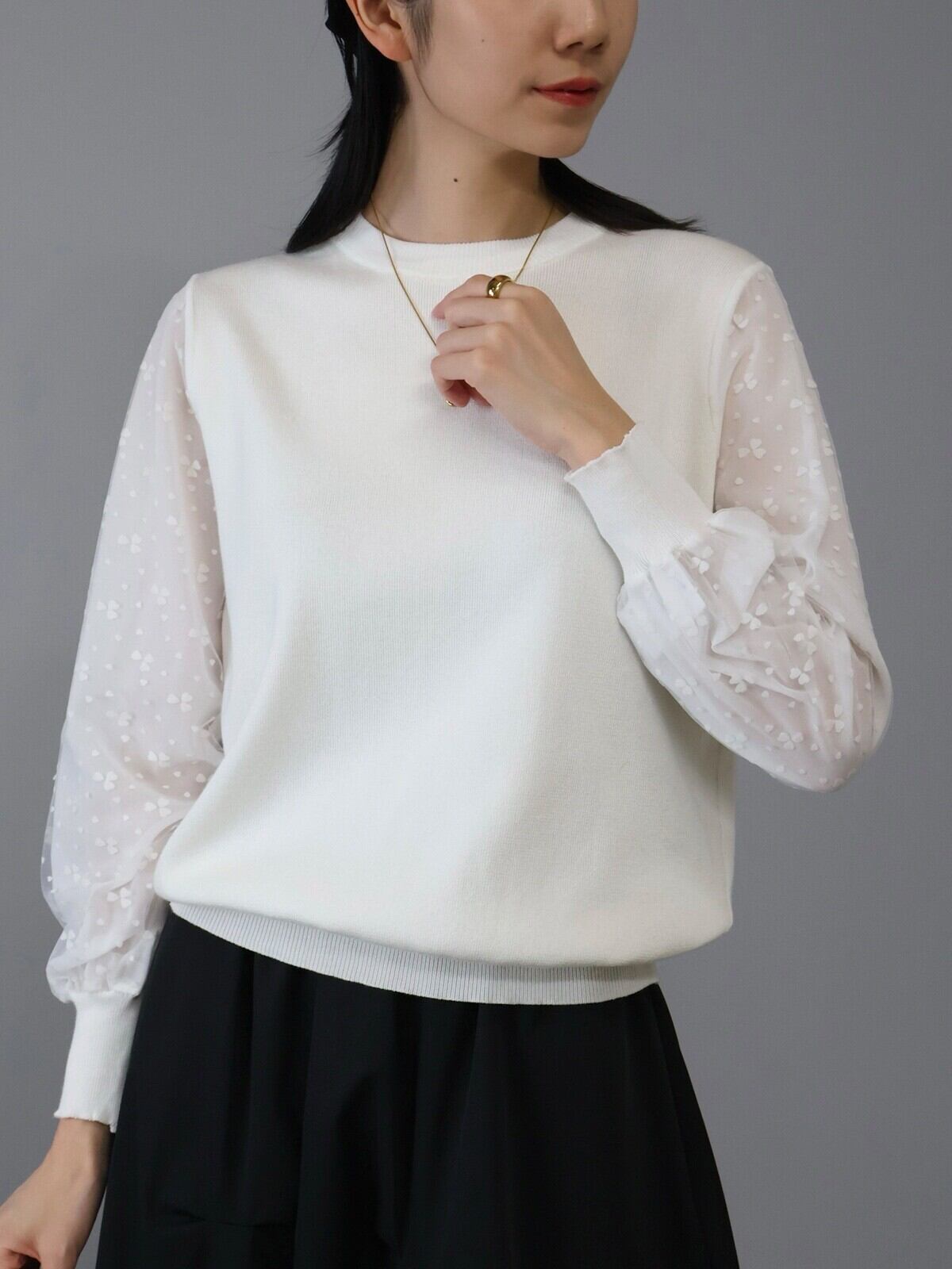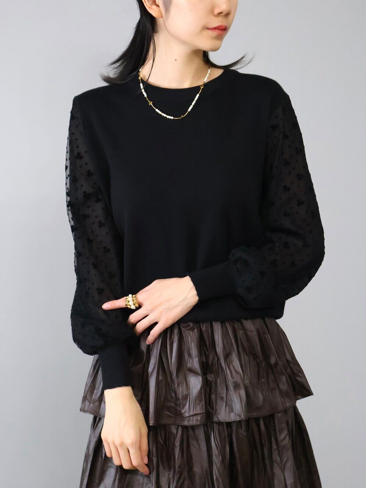 デザインフラワー柄の袖デザインがポイントになりふんわりとボリュームもあり女性らしく上品な印象に仕上がっています。裾はリブ入りでスッキリとコンパクトに。ボトムスとのバランスもとりやすく普段使いしやすい一着です。
