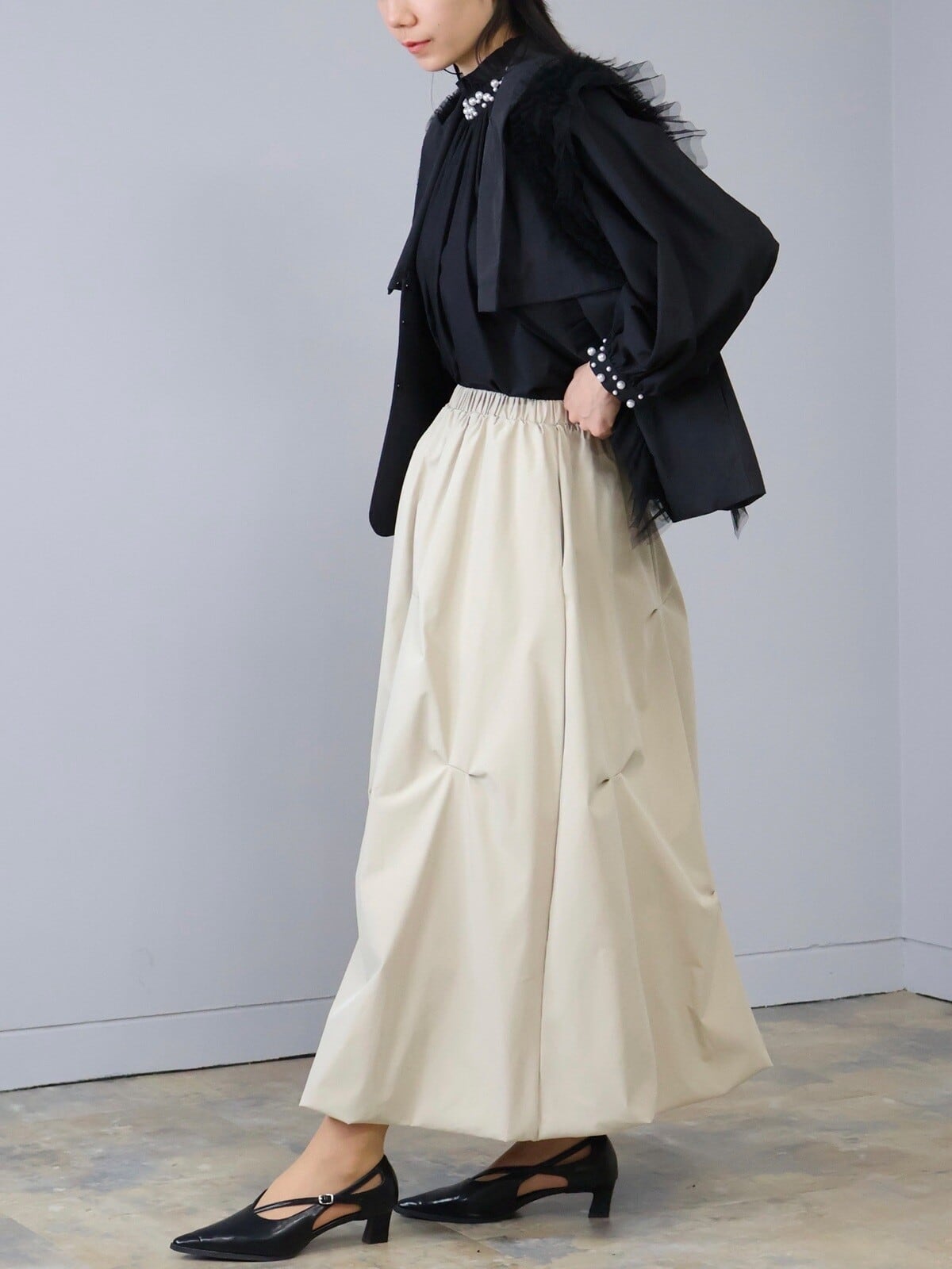 裾にかけてふわっと広がるバルーンシルエットです。