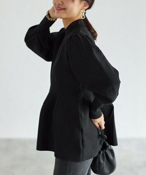人気のペプラムシルエットのニットプルオーバー袖のパフスリーブとプチハイネックがポイントに張りのある生地感でシルエットがしっかり作れるから着るだけで着映え力が高まります身頃部分と袖部分に縦のラインを入れてIラインが強調され細見え効果も期待できます