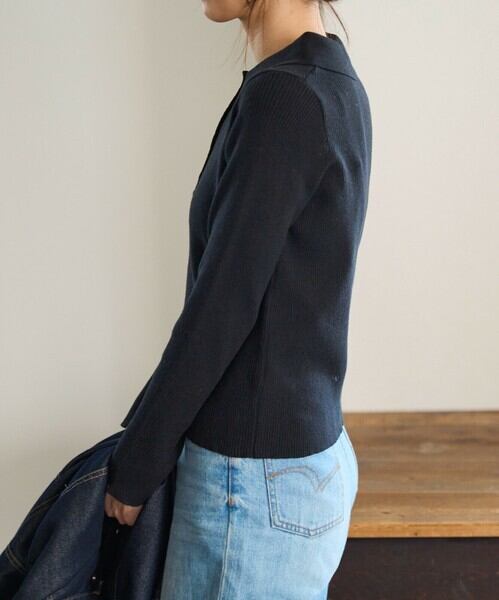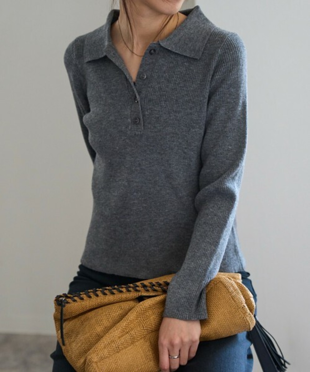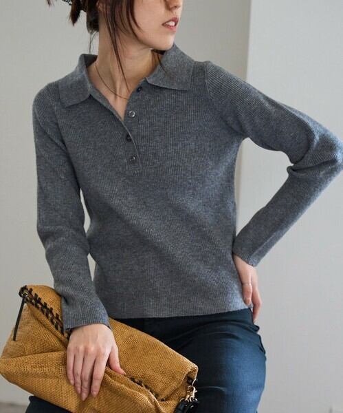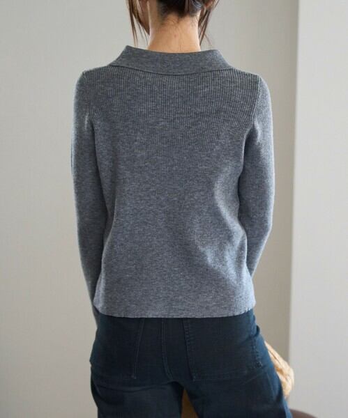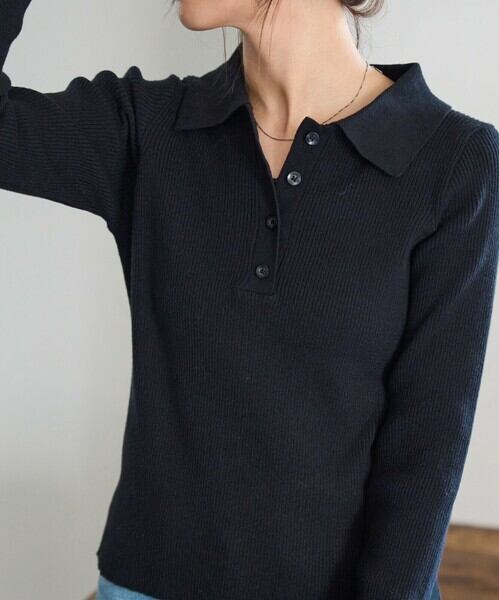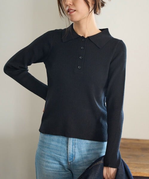 ポロ襟付きのニットで上品さとカジュアルさを兼ね備えた一着。
