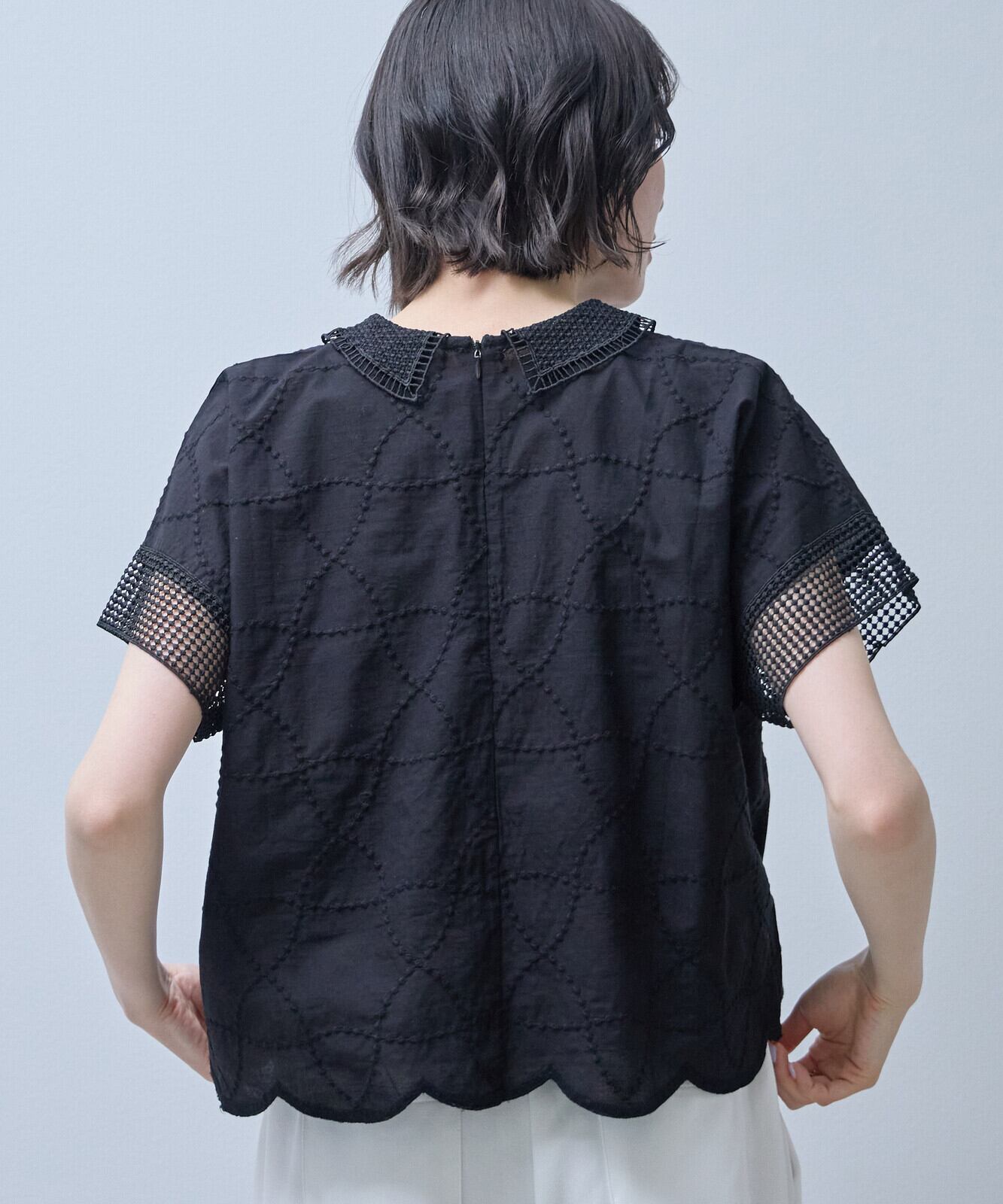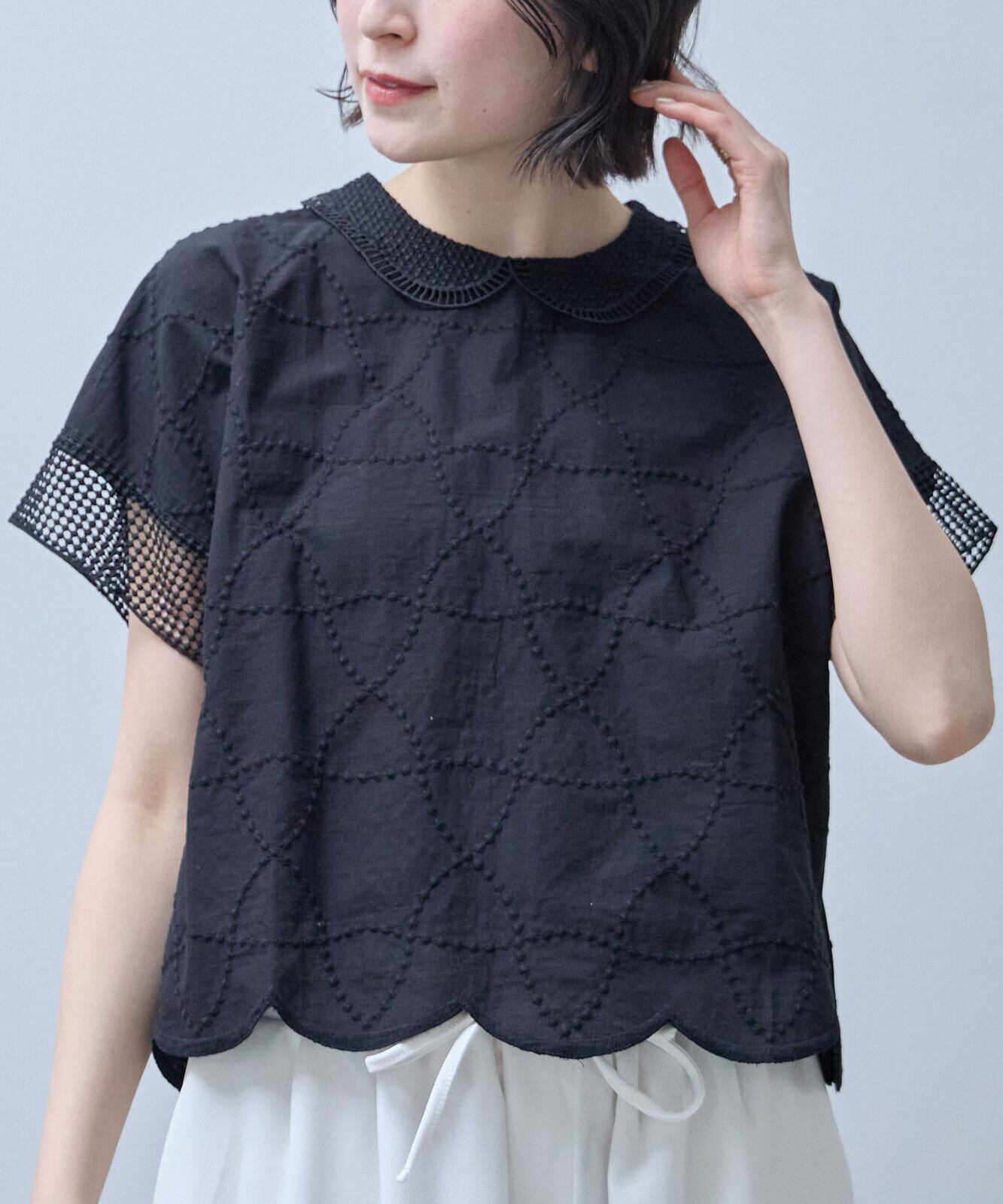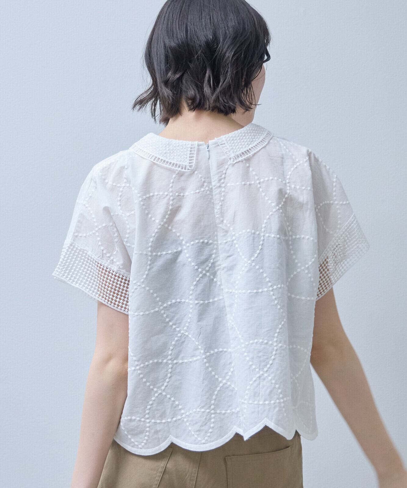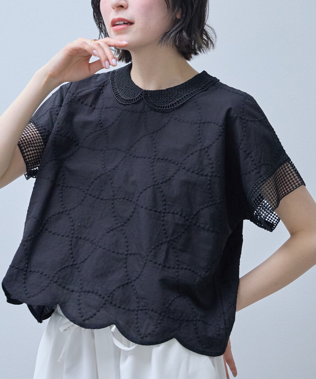 襟付きで裾はスカラップになっておりフェミニンからアンティーク調まで幅広い印象を演出できるのが、魅力です。