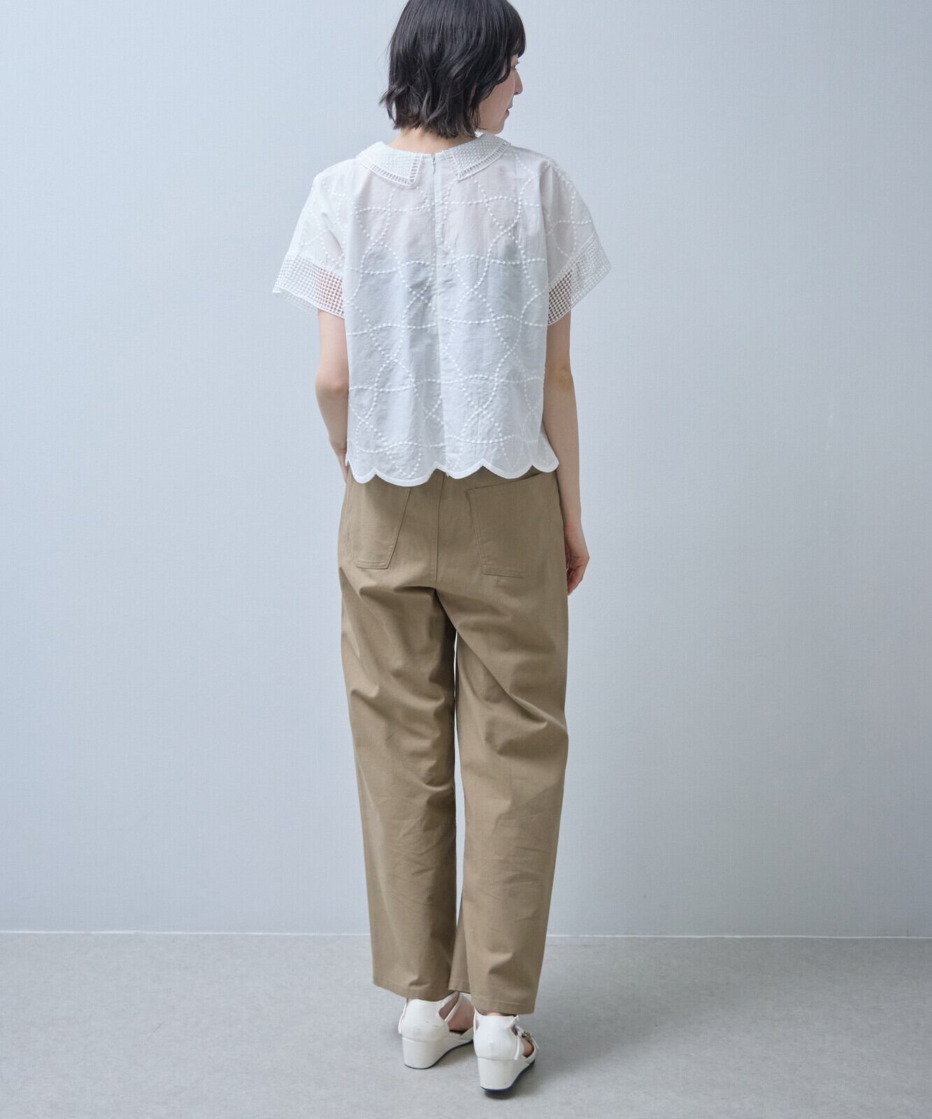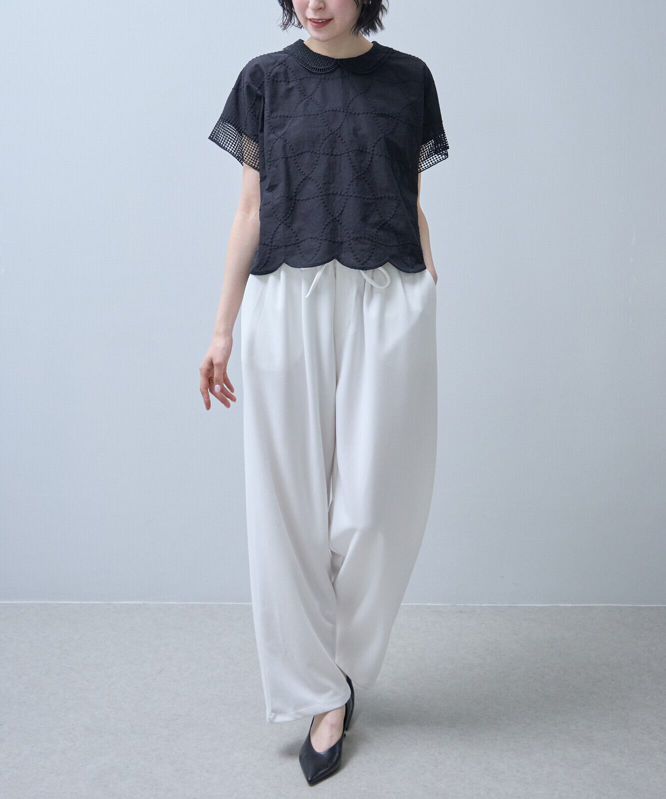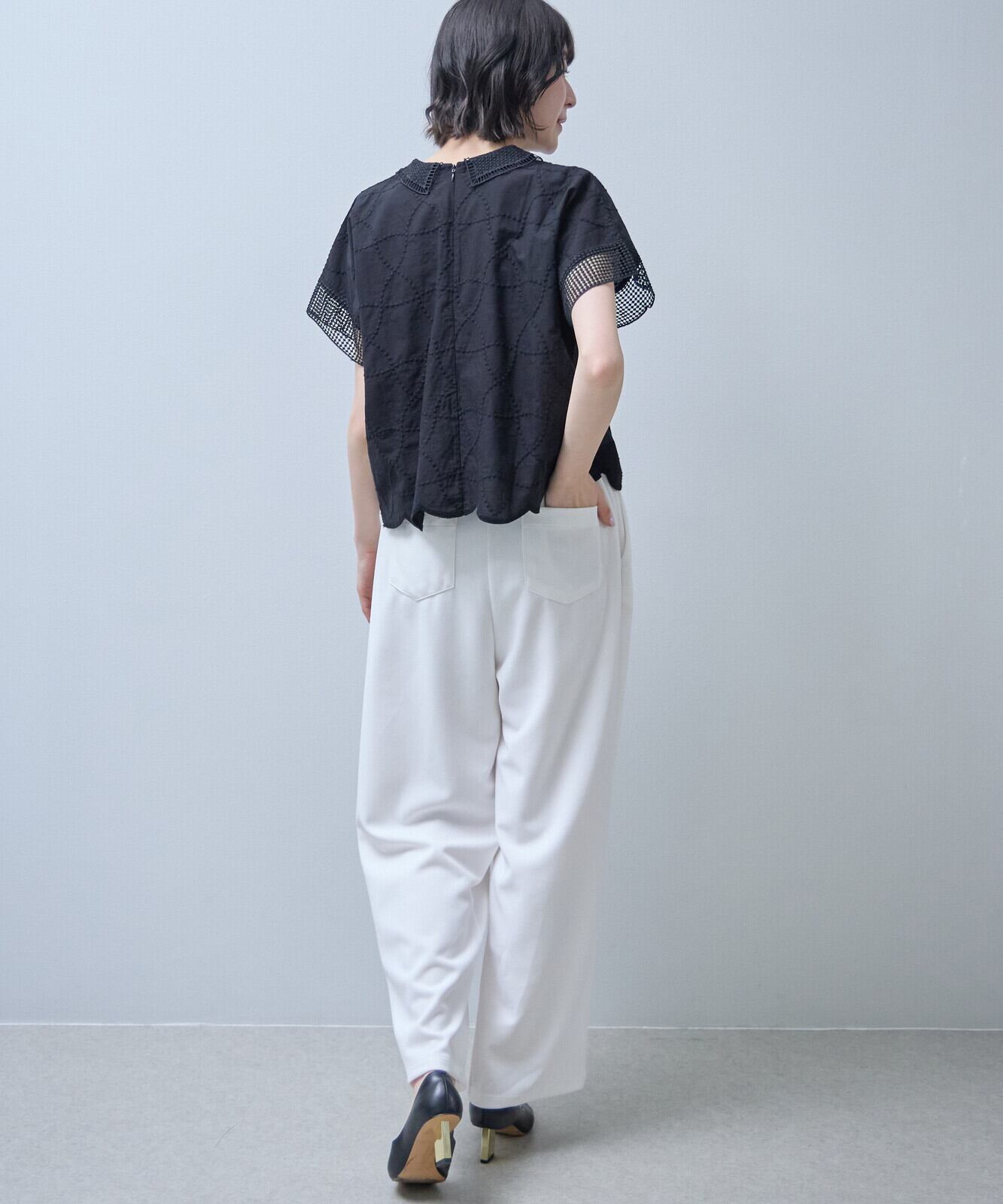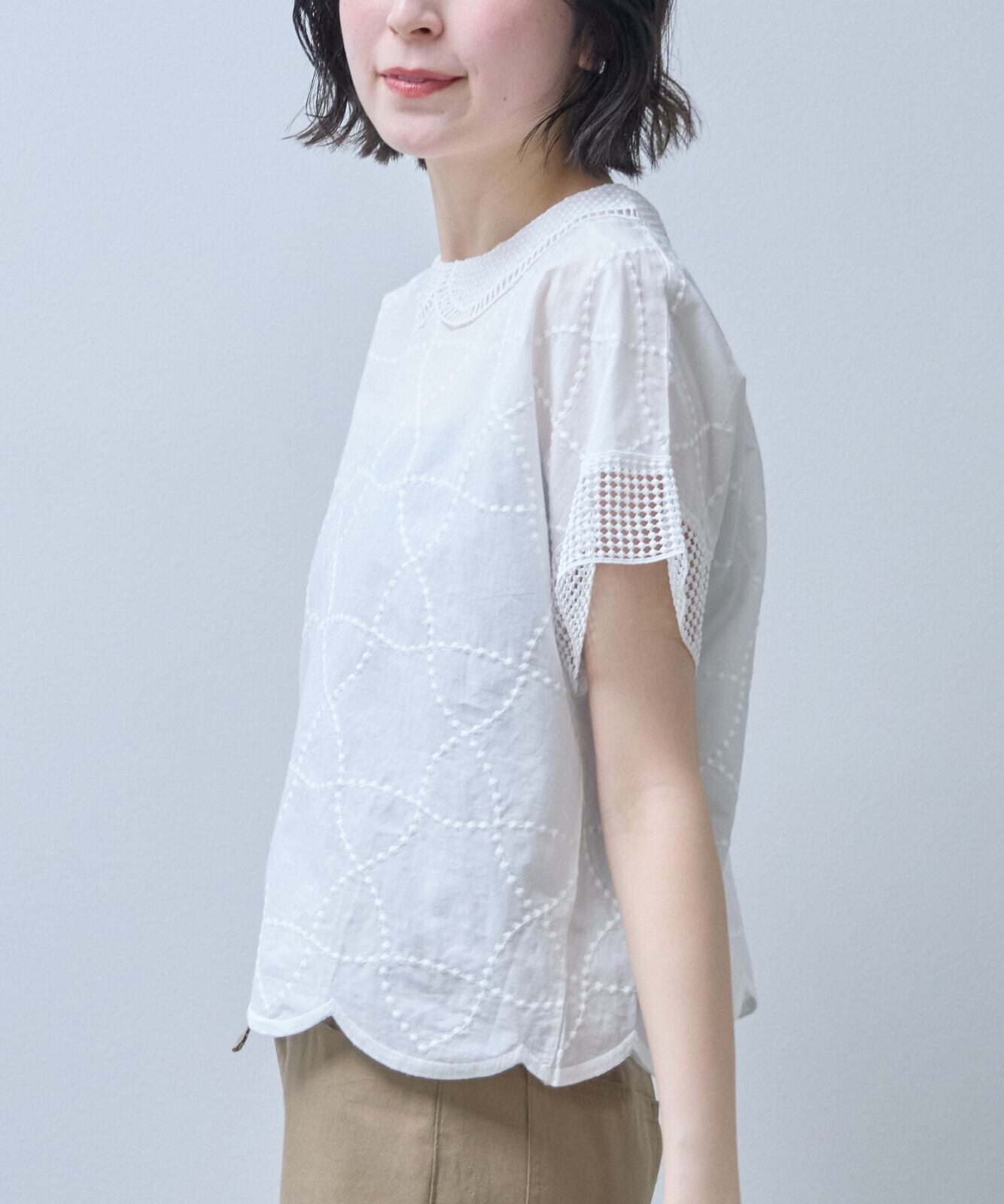 襟付きで裾はスカラップになっておりフェミニンからアンティーク調まで幅広い印象を演出できるのが、魅力です。