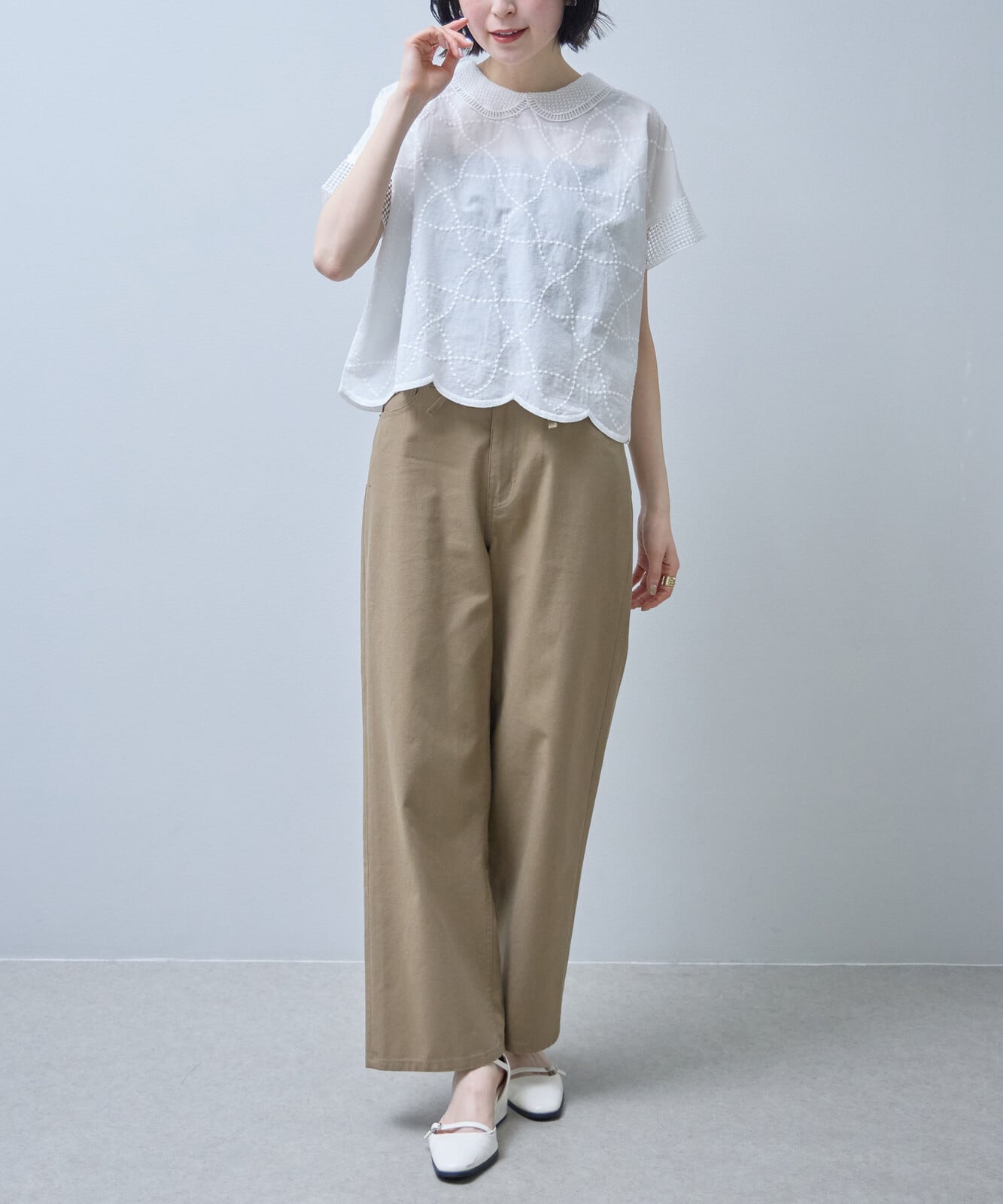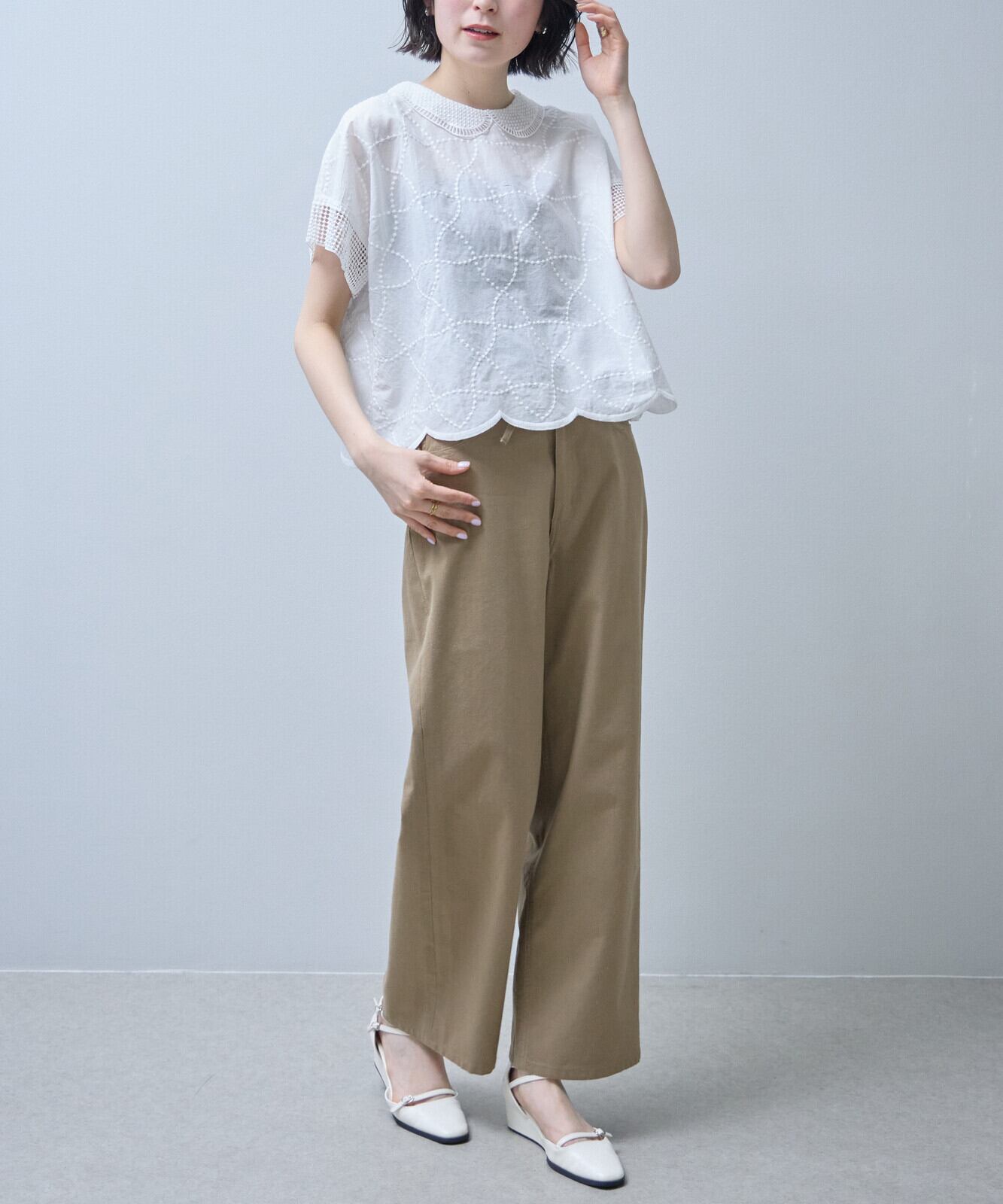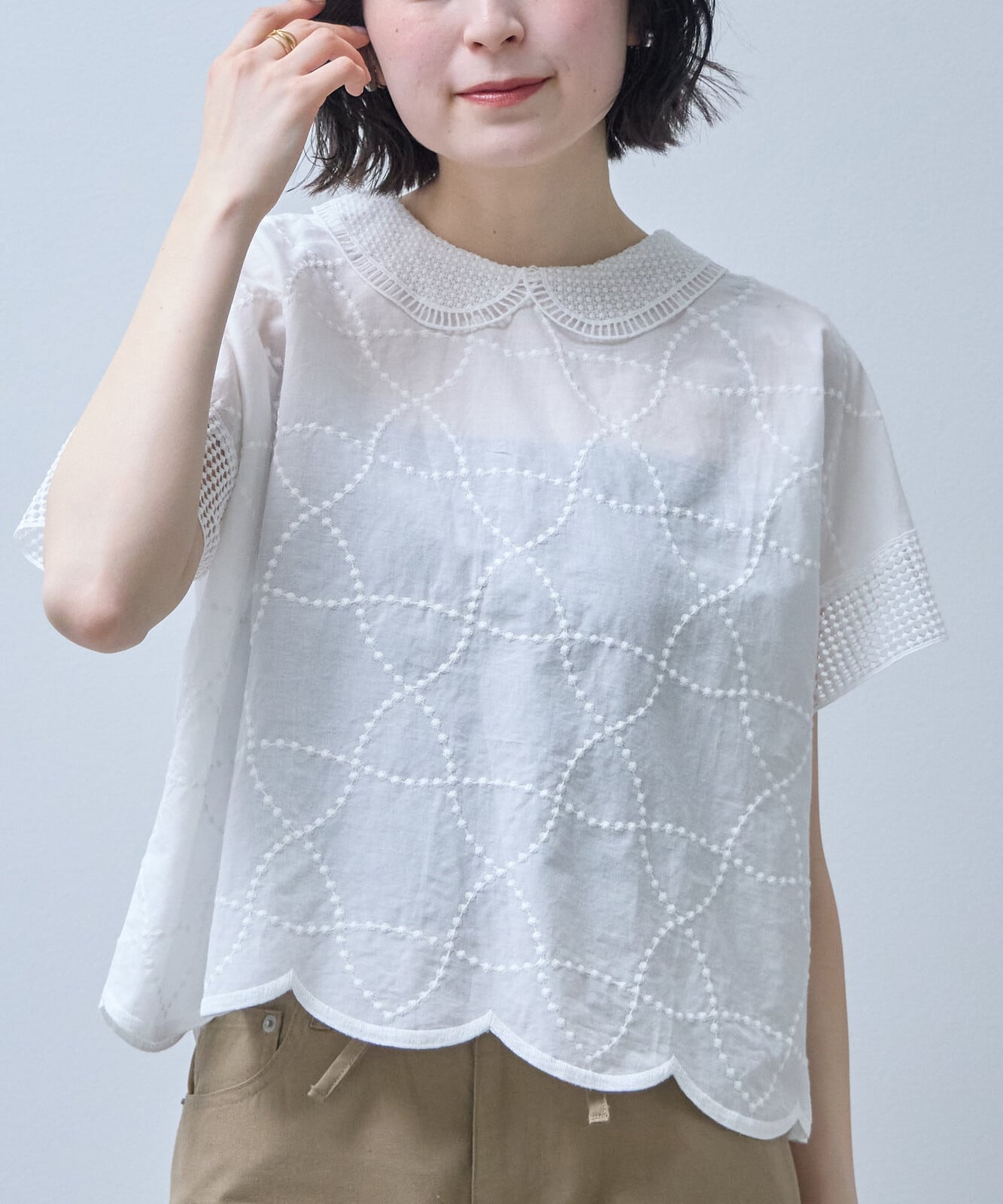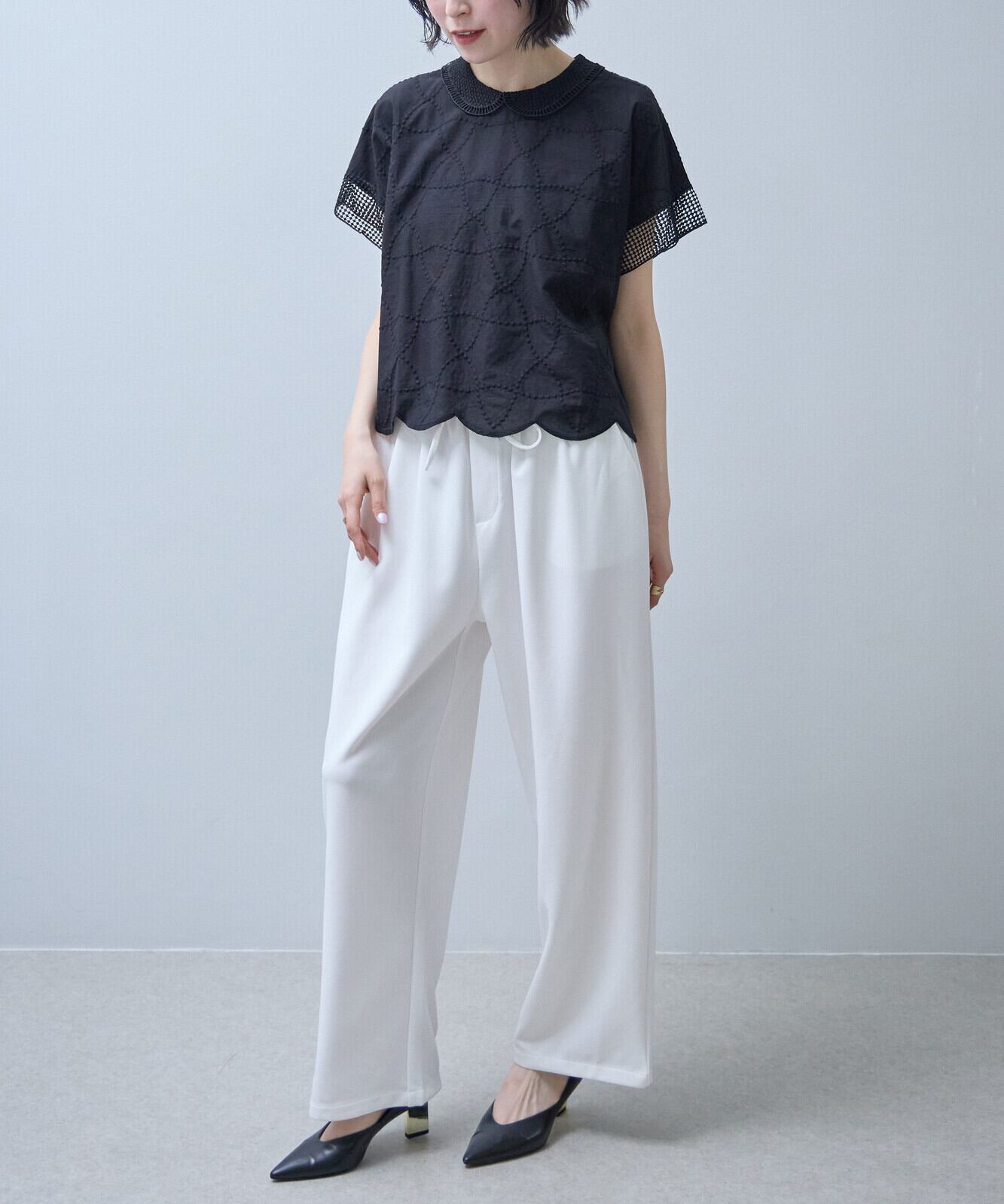 襟付きで裾はスカラップになっておりフェミニンからアンティーク調まで幅広い印象を演出できるのが、魅力です。