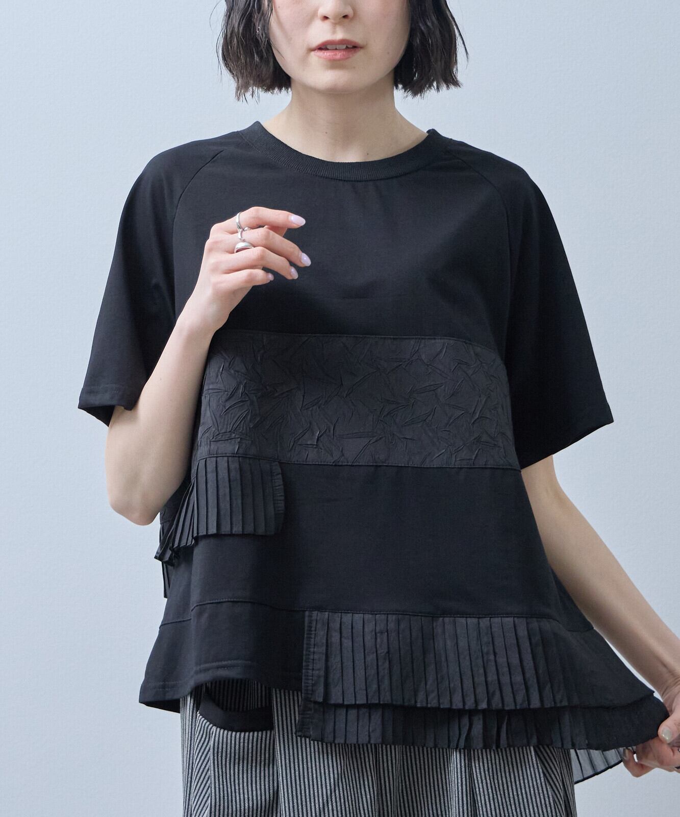 シンプルなクルーネックが、個性的な裾のデザインを引き立てつつ、上品な印象を与えます。