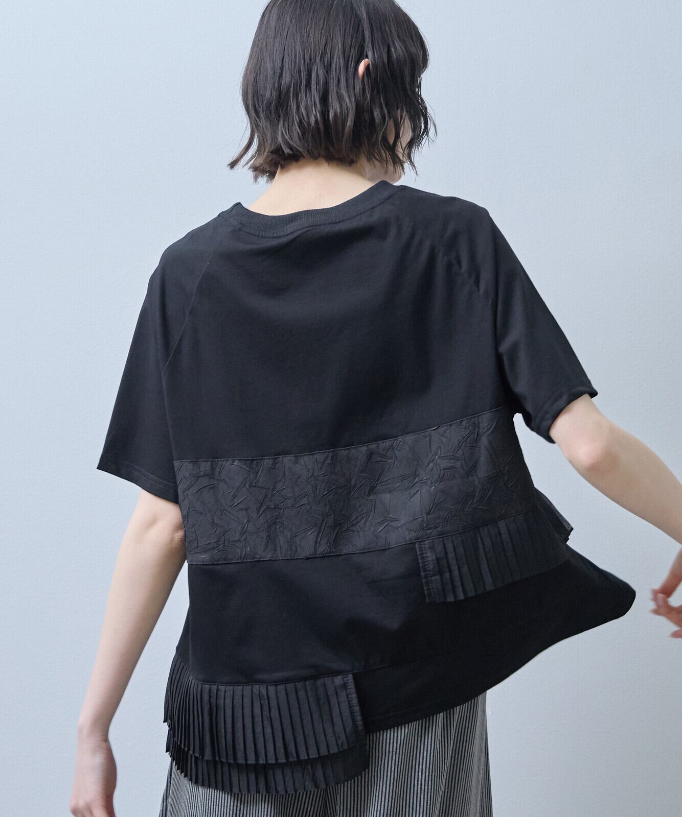 右側はフラット、左側には繊細なプリーツを重ね、視覚的なコントラストを楽しめる贅沢な作り。