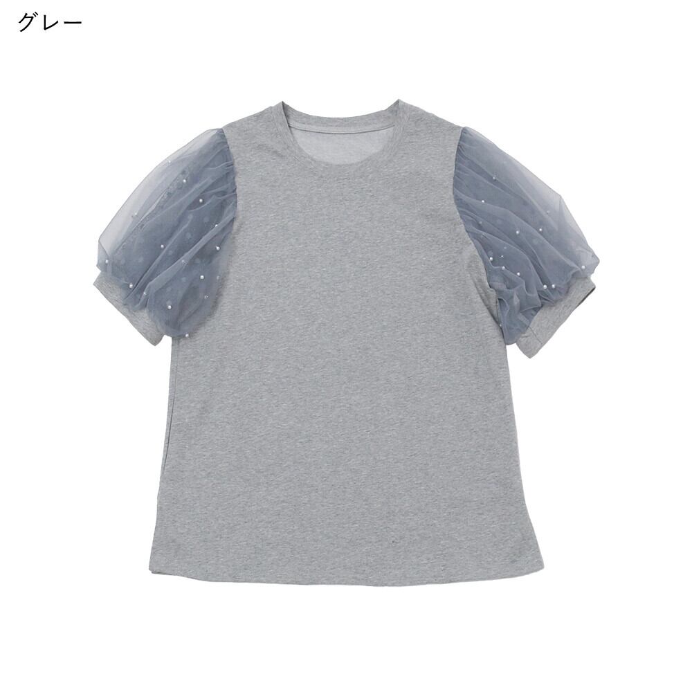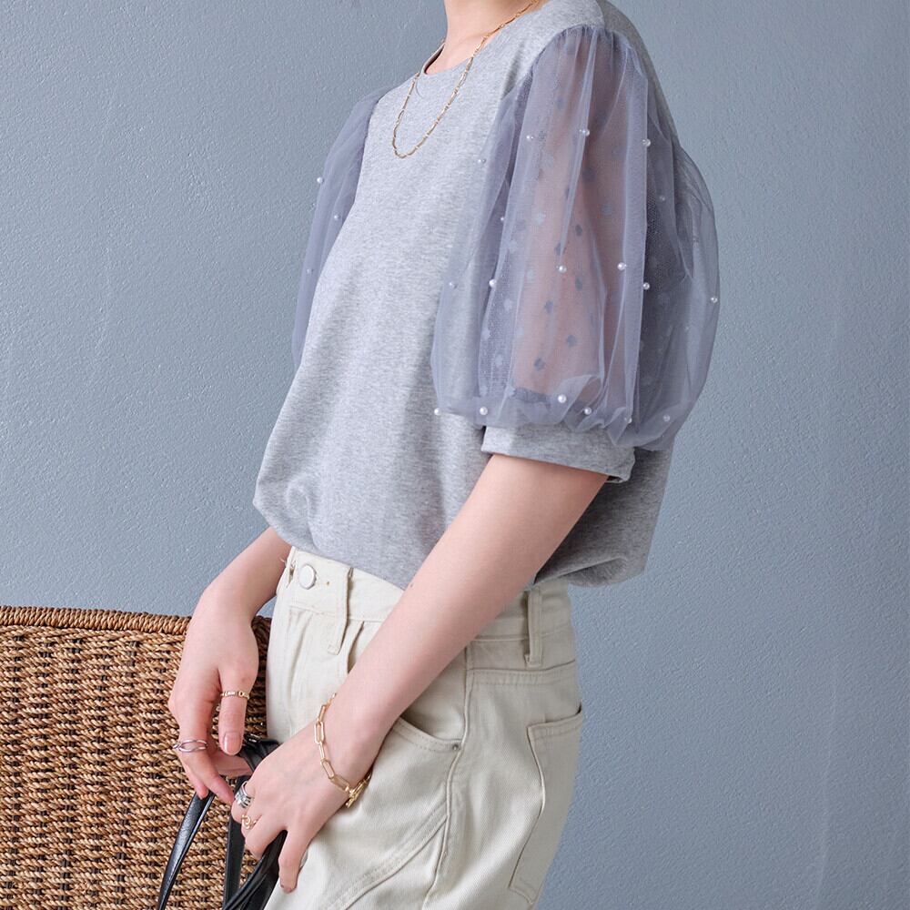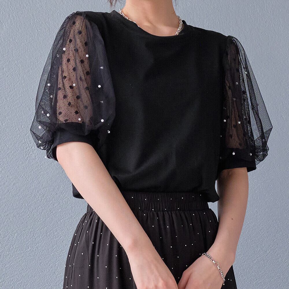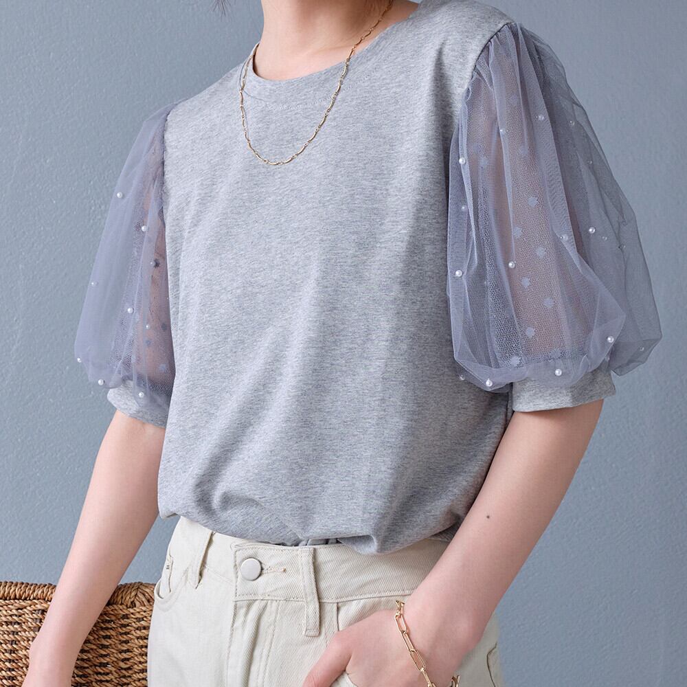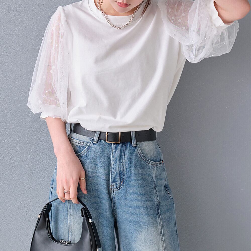 チュール素材の袖デザインが目を惹く、華やかな半袖Tシャツ。