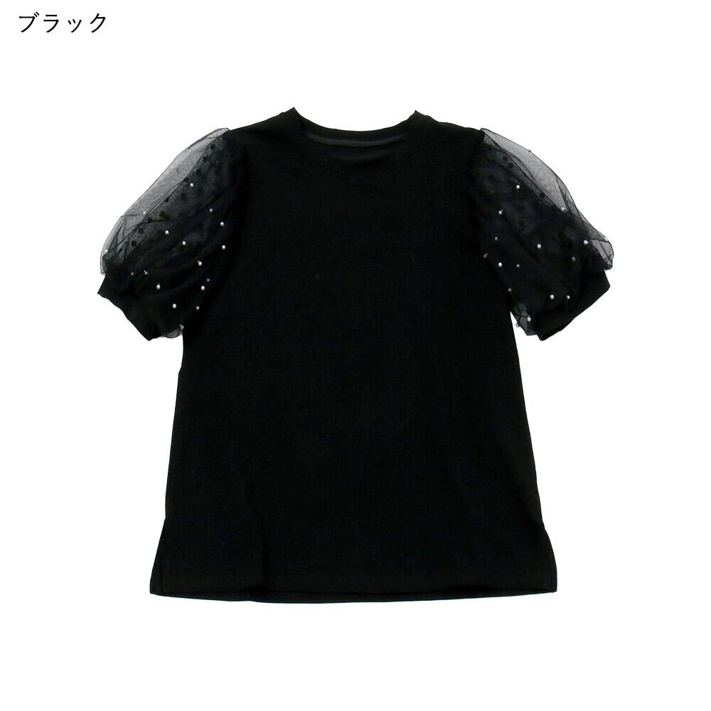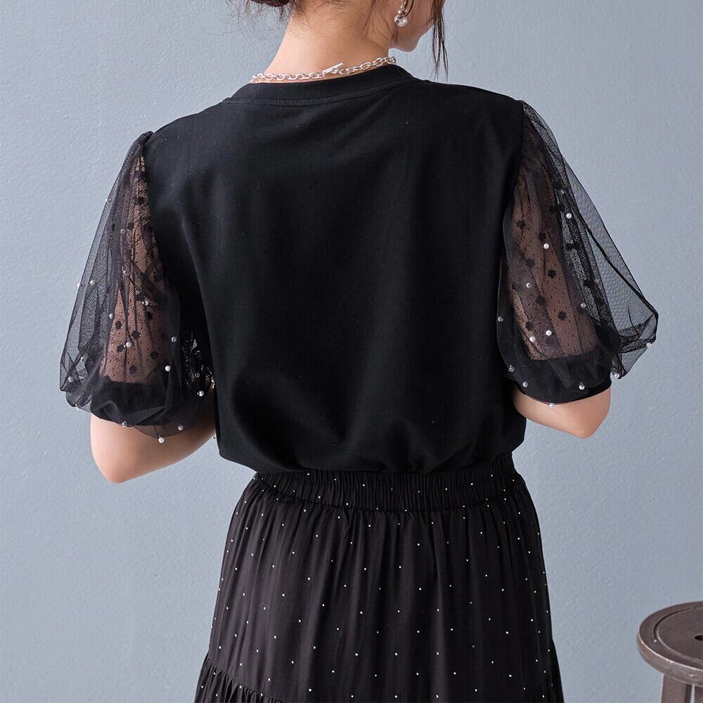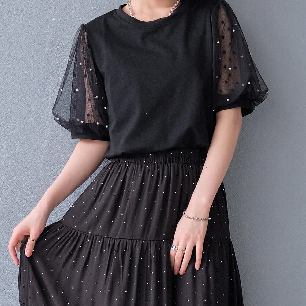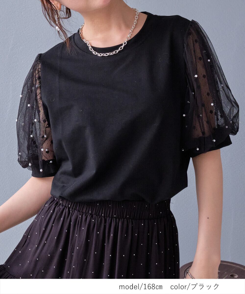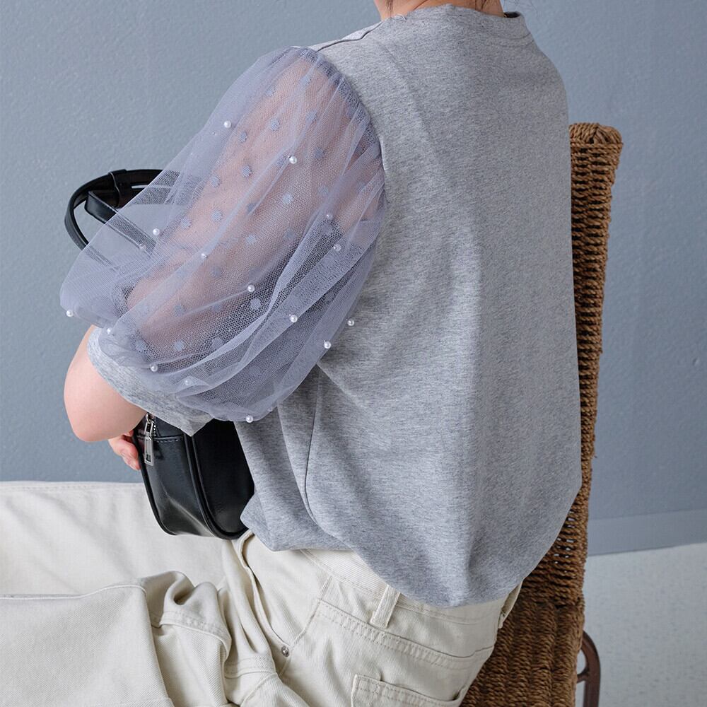 チュール素材の袖デザインが目を惹く、華やかな半袖Tシャツ。