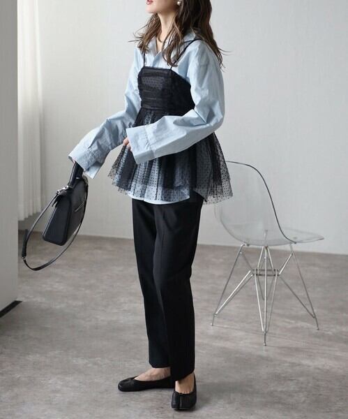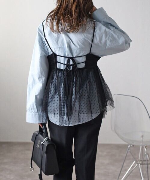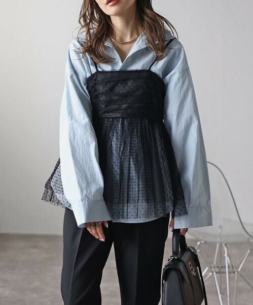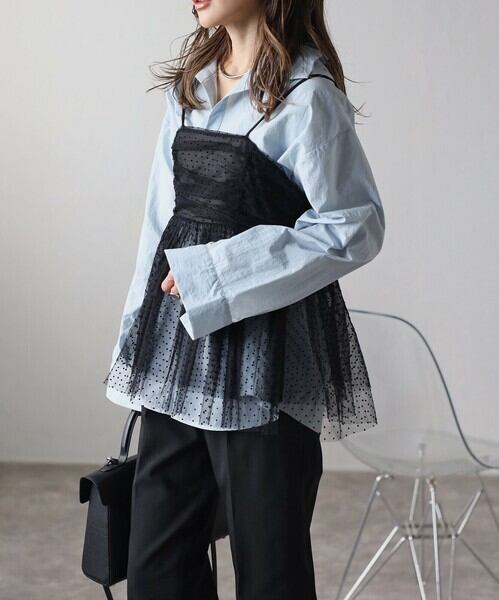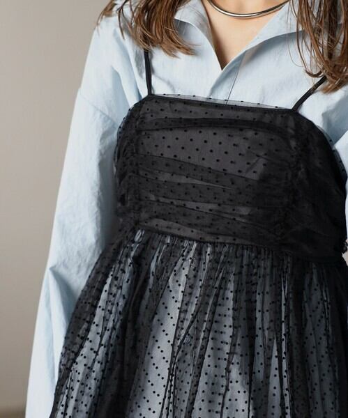 ドット柄が大人可愛さを演出。華やかなレイヤードスタイルが楽しめるチュールキャミソール